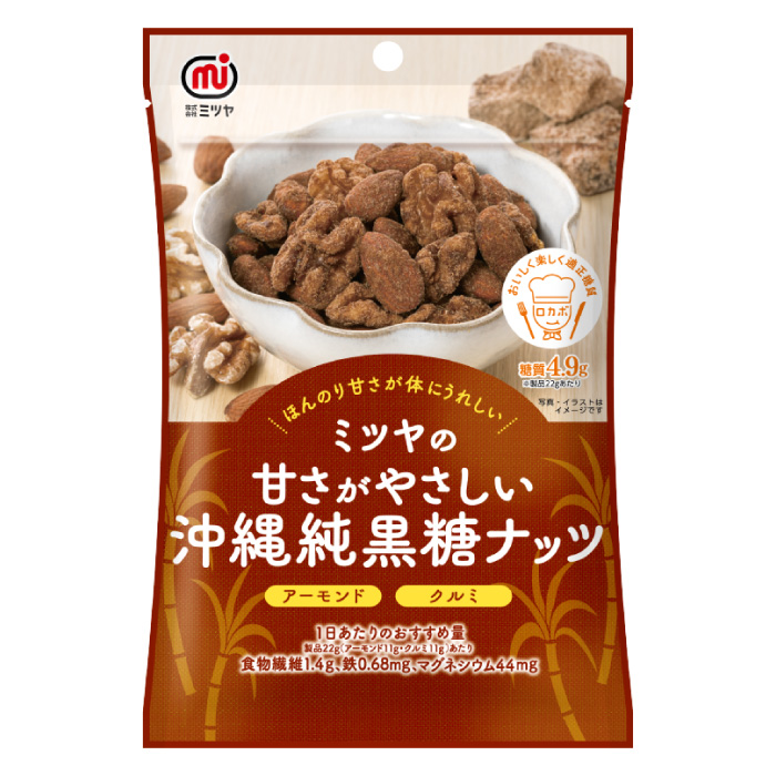 黒糖には「純黒糖」と「加工黒糖」があり、純黒糖はさとうきびだけで出来ています。 本製品は沖縄県の西表島の「純黒糖」を使用し、塩も沖縄の海から生まれた海塩「ぬちまーす」を使用しています。 マイルドな「ぬちまーす」の塩味が、黒糖の甘みにさらに深みを加え、 アーモンドとクルミを甘しょっぱくて癖になる味わいに仕上げました。口に入れた瞬間に広がる黒糖の風味とやさしい甘さ、アーモンドのカリッと感、クルミのほどける食感がそれぞれ楽しめます。