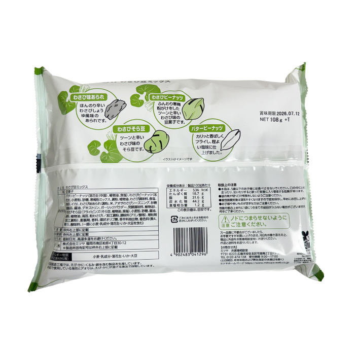 わさび味あられ、わさびピーナッツ、わさびそら豆、バターピーナッツの豆菓子がミックスされた小袋6袋がセットになった商品。味・食感・香りのバランスが絶妙で、最後まで飽きずに楽しめます。ピリ辛系が好きな方にはたまらないラインナップです。