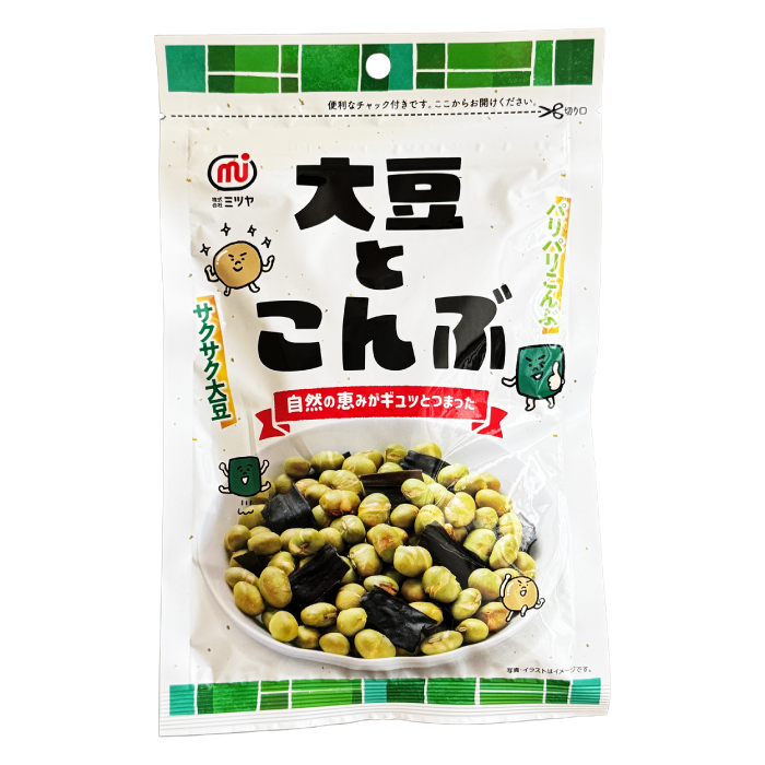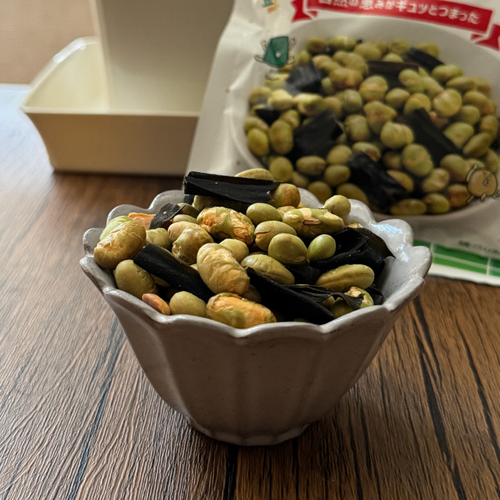 味うす青大豆(大豆(中国)、植物油、食塩)、おつまみ昆布(昆布、乳糖、醤油、砂糖、食塩)/調味料(アミノ酸等)、(一部に小麦・乳成分・大豆を含む)